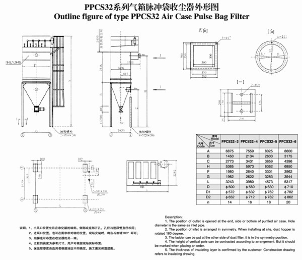 This series dust filter is used outdoor. Different chambers and bags come into different specifications. The bag quantity is 32, 64, 96 and 128 bags. The whole series have 33pcs of specifications. The diameter of filtering bag is all 0130mm. The length of filtering bag has 2450mm and 3060mm. This series dust filter can work at positive pressure or minus pressure. Body structure has no any changes. Dust efficiency can meet over 99.9%. Moisture of purified air is less than 100mg/m3(standard). Main technical parameter of this series dust filter refer to attaching table. If this series dust filter is used in high chilled zone where calculated temperature of heating outdoor is less than minus 25°C,it should add heating device and the shell of dust filter need to add insulating layer.