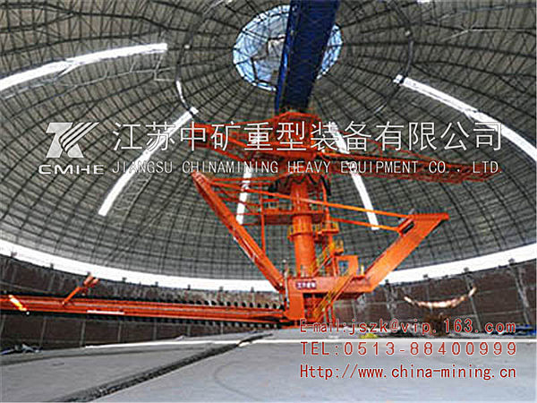 圓形堆取料機主要由可圍繞中心柱旋轉的懸臂堆料機、中心柱、斗輪取料機或橋式斗輪取 料機,或刮板取料機、電氣與控制系統、電纜滑環等組成。中心柱安裝在料場的中央。中心柱上部安裝有的懸臂堆料機,懸臂堆料機可繞中心柱在 360度范圍內回轉和俯仰,懸臂俯仰驅動采用液壓 油缸的驅動。通過回轉和俯仰實現不同位置的堆料作業。取料機是一臺繞中心柱回轉的橋式刮板取料機或斗輪取料機,或者是橋式斗輪取料機。取料機取料后將物料輸送至中心柱下部的出料溜斗,通過漏斗將物料卸至地下的帶式輸送機運出料場。