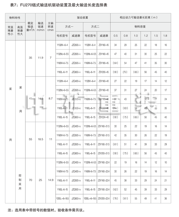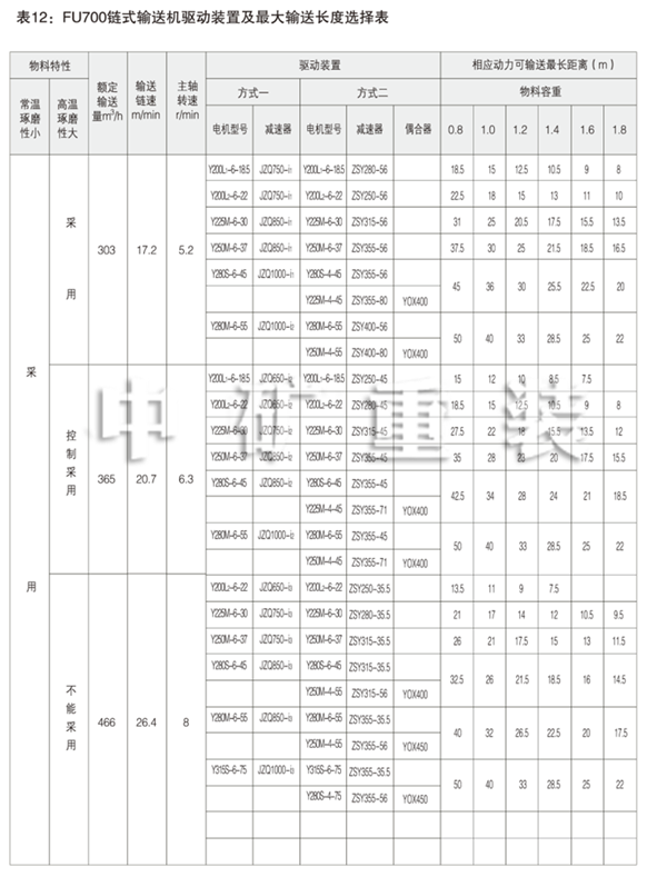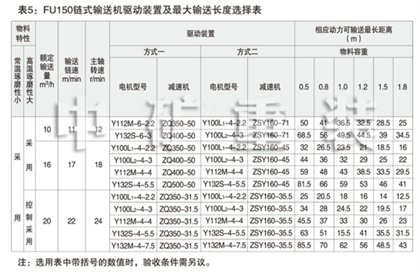 表5: FU150鏈?zhǔn)捷斔蜋C(jī)驅(qū)動裝置及輸送長度選擇表 Table 5: FU150 Chain Conveyor Drives and Max Conveying Distances